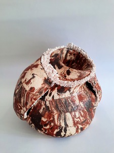 Langerekte vorm , met bol middenstuk. Paperclay, opgegebouwd uit stroken. Kleuroxydes. Geglazuurd.